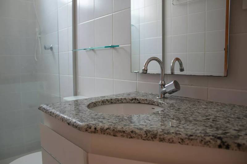 Banheiro social com bancada em granito, espelho e box em blindex