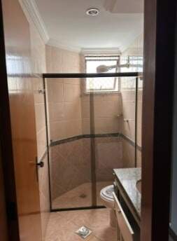 Banheiros com armário, espelho e box em blindex